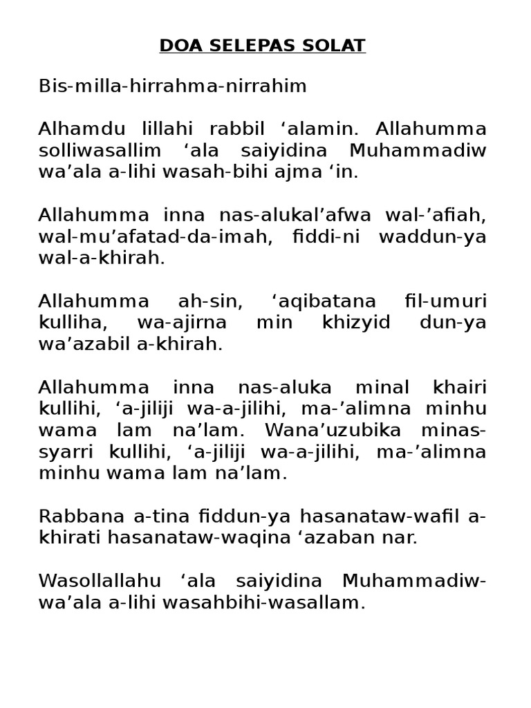 Ianya merupakan satu tanda kerendahan hamba terhadap allah s.w.t dan boleh dilakukan secara individu atau berkumpulan (berjemaah). Berikut adalah himpunan doa selepas solat dengan teks bahasa arab. Berilah keampunan kepada kami, sesungguhnya engkau maha pengampun lagi maha penyayang.